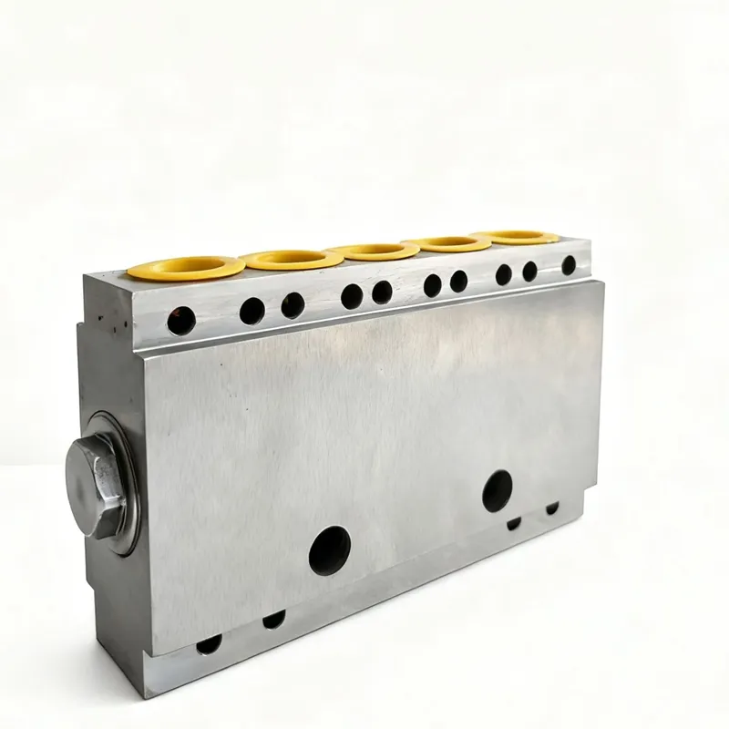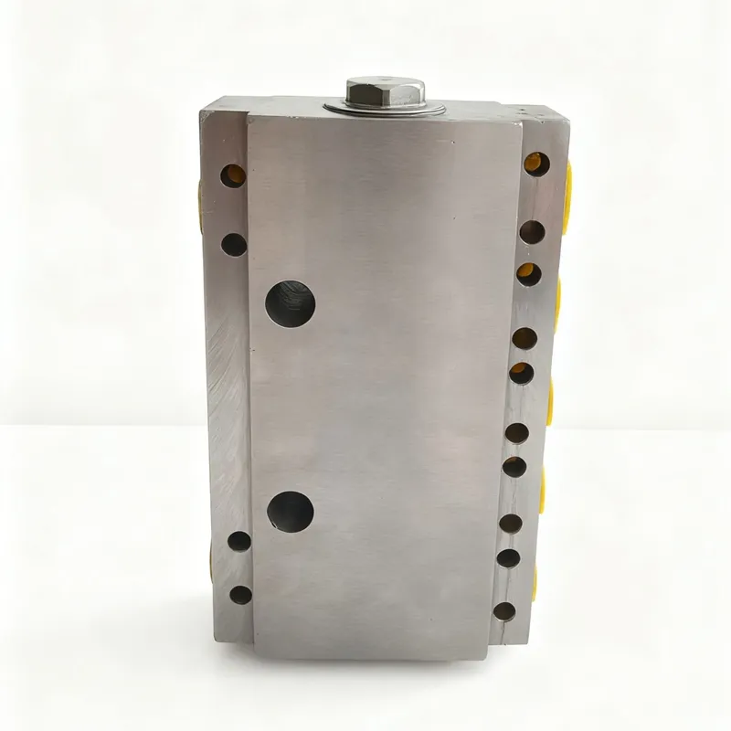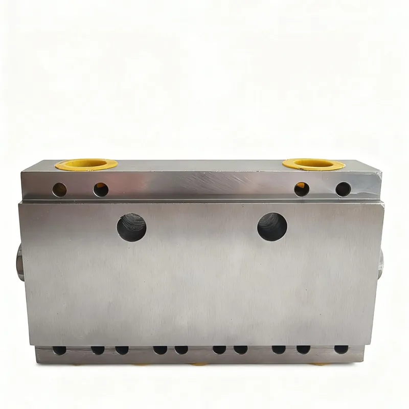 Гидравлический двусторонний замок состоит из корпуса, двух комплектов узлов золотников односторонних замков и управляющего поршня. При выдвижении домкрата жидкость высокого давления через распределительный клапан поступает в нижнюю полость одного узла золотника одностороннего замка; этот золотник открывается и одновременно толкает управляющий поршень, который открывает другой узел золотника в обратном направлении, позволяя жидкости высокого давления поступить в поршневую полость домкрата, в то время как жидкость из штоковой полости сливается; после прекращения подачи жидкости оба золотника односторонних замков закрываются, и жидкость в поршневой и штоковой полостях домкрата блокируется. При втягивании домкрата принцип работы аналогичен принципу при выдвижении. Регулировка давления срабатывания предохранительного клапана позволяет защитить рабочие полости домкрата высокого давления, обеспечивая, чтобы рабочее сопротивление не превышало номинальное значение. Данный клапан использует модульную конструкцию, вставные золотники и металлическое уплотнение PEEK, характеризуется удобством обслуживания, надежностью работы и длительным сроком службы.